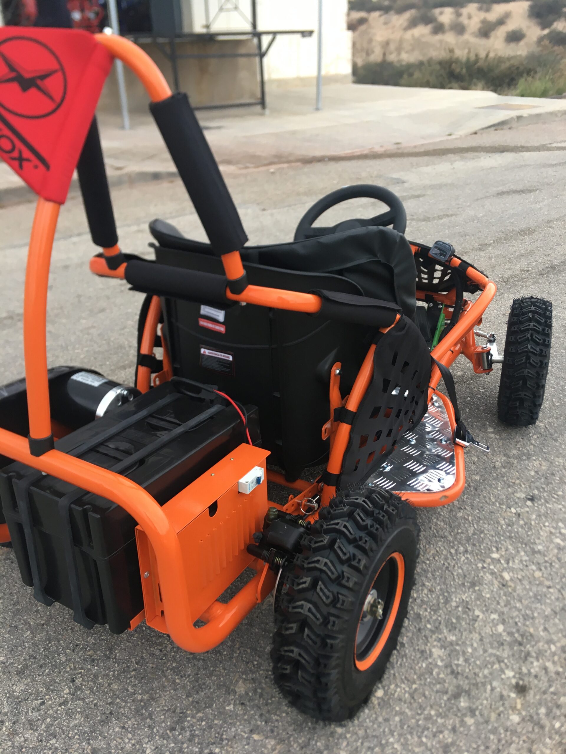 Nuevo Buggie GO Kart 1000w eléctrico de espectacular diseños para edades a partir de 5 años, gracias a la regulación de su asiento podrás adaptar el vehículo para niños de diferentes altura. Gracias a su chasis de acero y su barra anti vuelco hacen de este buggie GO Kart un vehículo mas seguro.Compuesto por unas ruedas de 6” , 3 velocidades y marcha atrás.Es un vehículo que apasiona a todos los públicos y te proporciona grandes ratos de diversión.Aprovéchate de nuestra oferta con el envió gratuitoColores: