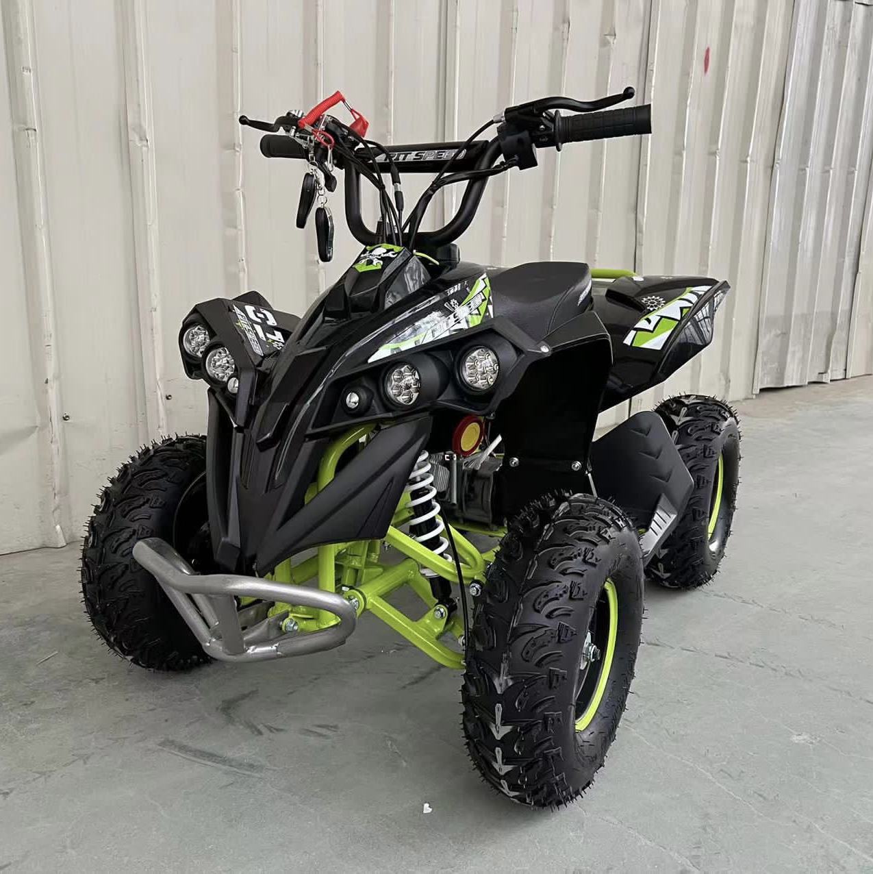 Mini quad infantil Goliat 49cc arranque eléctrico Nuevo modelo de Mini quad infantil Goliat de 49cc con nuevas prestaciones y mejoras tanto en su chasis como en carcasas. Modelo de Mini quad infantil Goliat de 49cc con dos sistemas de arranque. Hemos añadido arranque eléctrico para facilitar su encendido para los más peques de la casa, manteniendo el arranque por tirador.