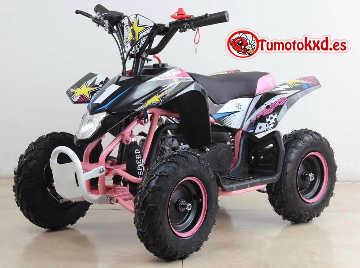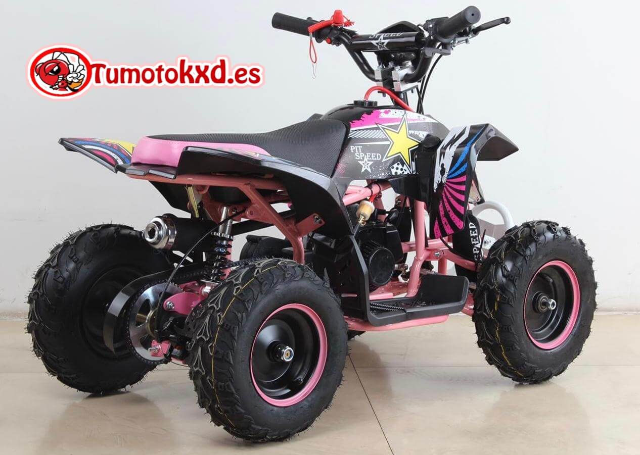del suelo al manillar 700 mm Mini quad infantil Rx 49cc. Con motor de 49cc de 2 tiempos refrigerado por aire. Es un mini quad pensado para los peques de la casa, ideal para iniciarse en este deporte. Potente, atractivo, ligero, un quad que va a sorprender a todos. Con todos los sistemas de seguridad, entre ellos dispositivo de hombre al agua, regulador de velocidad. En tumotokxd nos gusta dar la máxima calidad a nuestros clientes, presentamos el nuevo quad de 49cc RX, para niños, con una potencia de 3’5 cv y arranque por tirador es uno de los modelos más esperados para los peques de la casa.Este nuevo mini quad RX con su nuevo diseño de pegatinas y colores, ofrece más modelos tanto para niños como para niñas. Es el modelo más completo que puedes encontrar en el mercado, adecuado para asfalto, hierba y grava.