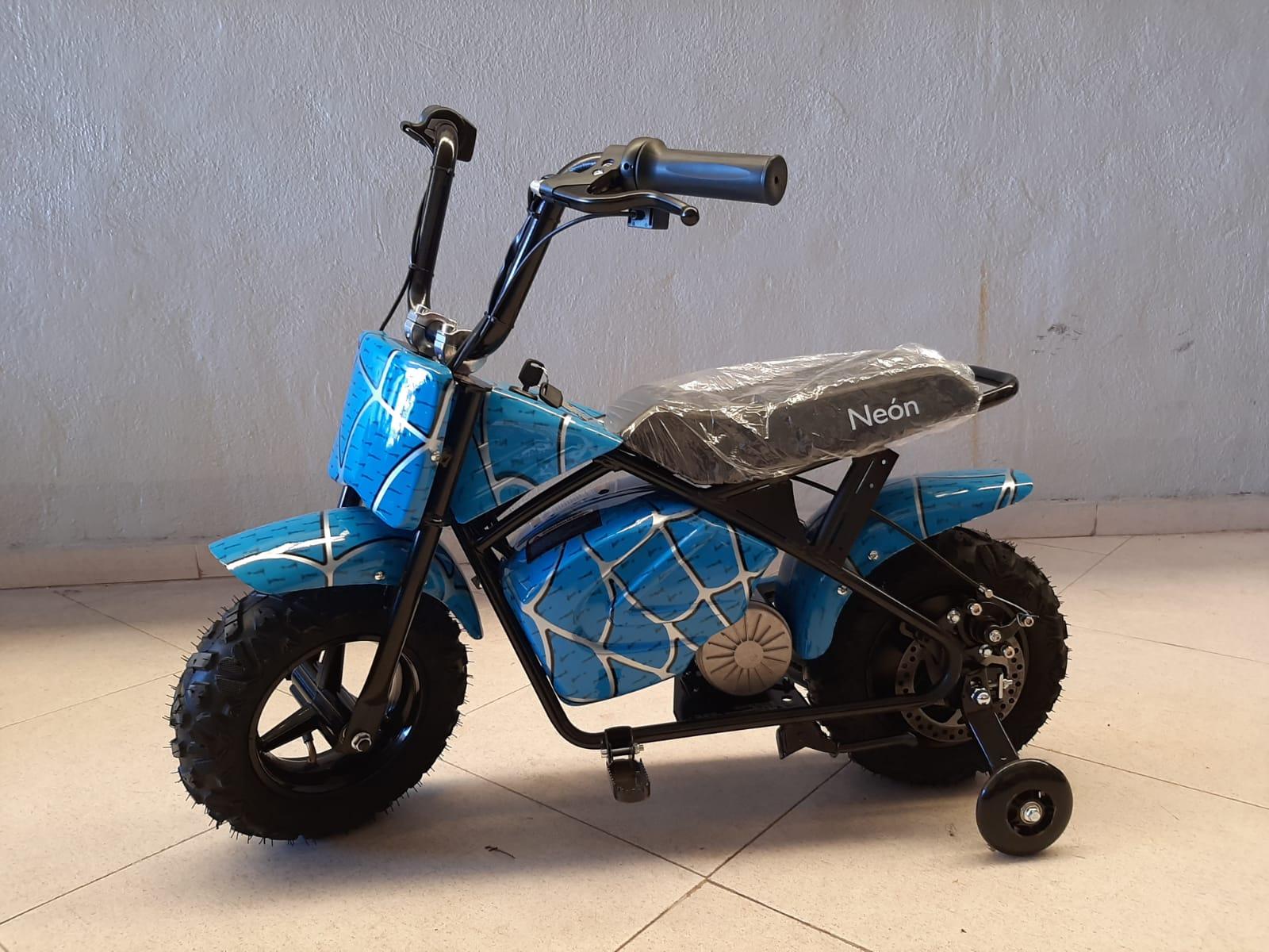 del asiento al suelo 420 mmNuevo modelo de mini moto eléctrica para niños con motor de 250w y 2 batería de plomo – ácido 12v a 7Ah ( 24V). El modelo de mini moto eléctrica Neón de 250w está enfocada para los más peques de la casa a partir de 2 años de edad hasta los 5 años.Mini moto eléctrica preparada con indicador de carga de batería y regulador de velocidad de 2 etapas ( 10Km/h y 20 Km/h), de esta manera podréis adecuar la velocidad a la peque y al peque.